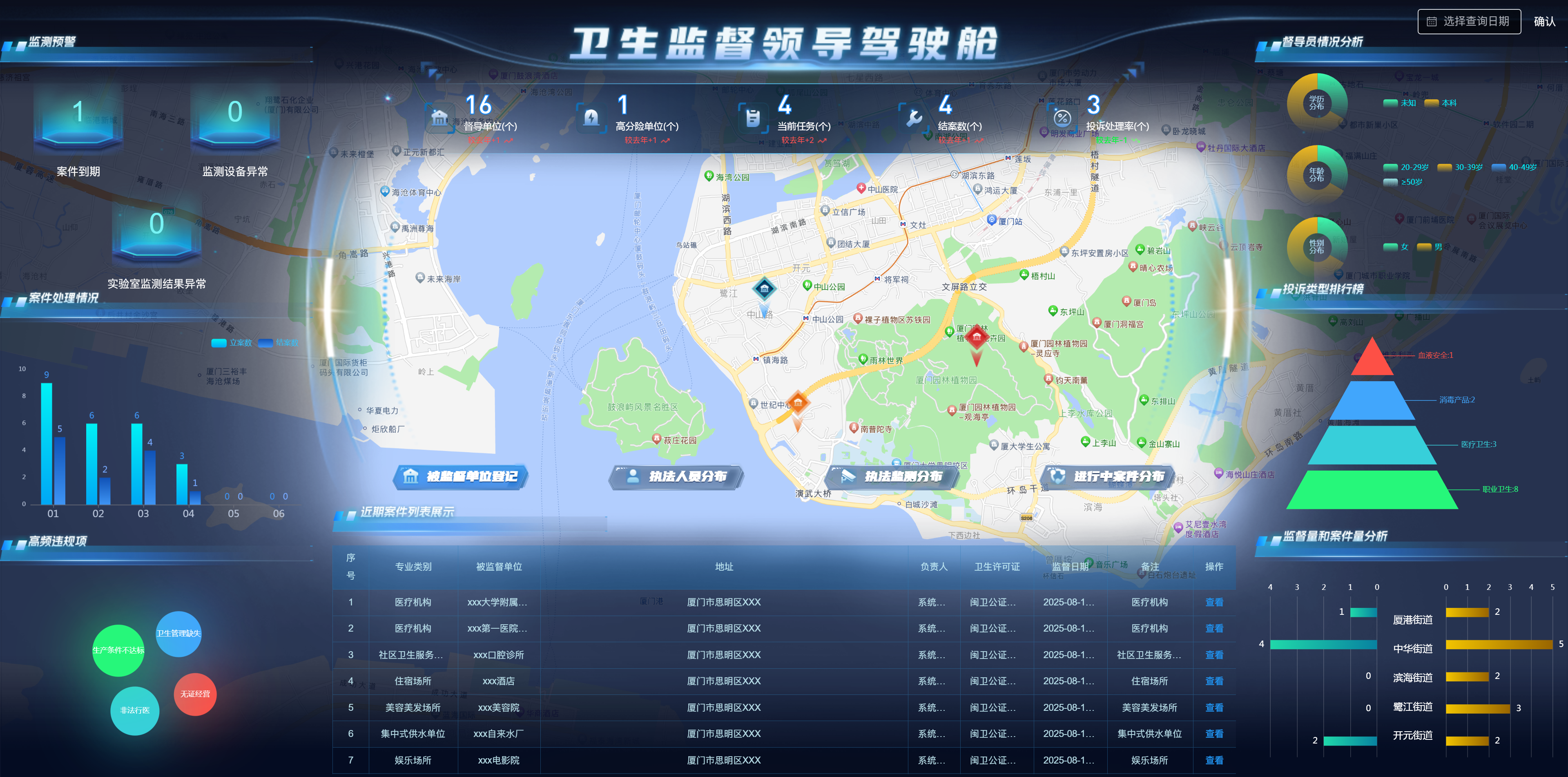 “智慧衛(wèi)監(jiān)綜合監(jiān)管服務(wù)管理系統(tǒng)”涵蓋監(jiān)督執(zhí)法應(yīng)用、非現(xiàn)場(chǎng)執(zhí)法應(yīng)用、碼上監(jiān)管、可視化駕駛艙、信息交換系統(tǒng)等內(nèi)容,實(shí)現(xiàn)加強(qiáng)衛(wèi)生監(jiān)督綜合執(zhí)法能力建設(shè),依法推進(jìn)衛(wèi)生監(jiān)督工作,不斷創(chuàng)新衛(wèi)生監(jiān)督執(zhí)法手段,提高衛(wèi)生監(jiān)督的監(jiān)管和應(yīng)急處置水平,通過建設(shè)智慧衛(wèi)監(jiān)系統(tǒng),將傳統(tǒng)現(xiàn)場(chǎng)監(jiān)管與非現(xiàn)場(chǎng)物聯(lián)網(wǎng)智能監(jiān)督監(jiān)測(cè)手段相結(jié)合,解決目前衛(wèi)生監(jiān)督機(jī)構(gòu)無法及時(shí)掌握和處置突發(fā)狀況的問題,做到在第一時(shí)間獲取現(xiàn)場(chǎng)數(shù)據(jù),在事件發(fā)生、升級(jí)前提前預(yù)警和處置,提高執(zhí)法效率。